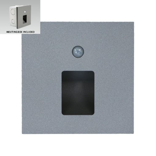 Szürke színű műanyag falba építhető lámpa természetes fehér színhőmérsékletű beépített LED fényforrással. A lámpa egyéb jellemzői: szenzoros, alkonykapcsolóval. 0-25 Lux fénynél működik. 30 másodpercet világít, a mozgásérézkelő 180 fokban lát. Érzékelési távolság 2-3 méter.