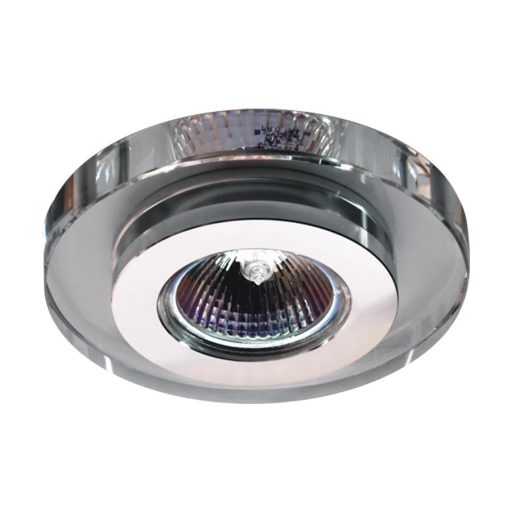 Króm színű fém vázas mennyezetbe építhető lámpa átlátszó színű üveg dekorral.