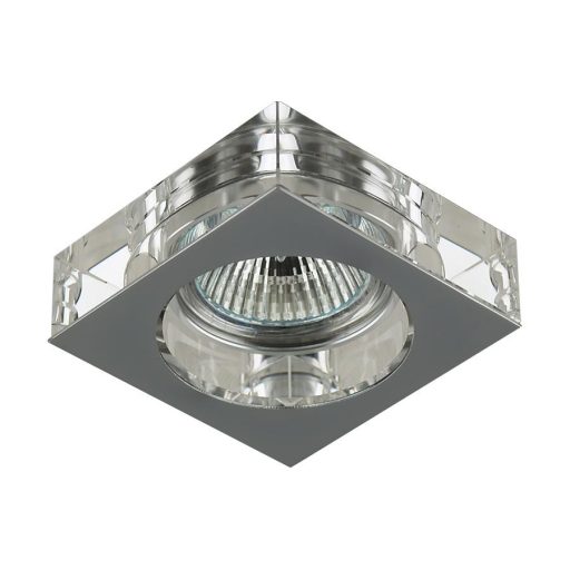 Króm színű fém vázas mennyezetbe építhető lámpa átlátszó színű üveg dekorral.