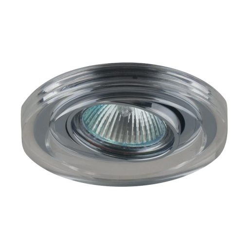 Króm színű fém vázas mennyezetbe építhető lámpa átlátszó színű üveg dekorral.