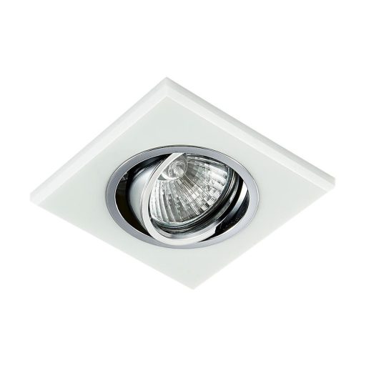 Króm színű alumínium vázas mennyezetbe építhető lámpa tejszínű üveg dekorral, billenthető foglalattal.