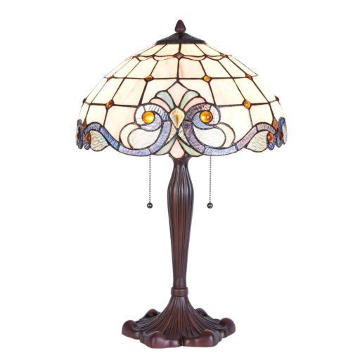 Bronzos barna színű polyresin vázas komód lámpa 40cm átmérőjű, mályvás, bézses árnyalatú alapon sárgás gyöngy és kékes lila árnyalatú, díszes Tiffany üveg búrával, húzókapcsolóval. A lámpában 2db külön kapcsolható E27-es foglalat található.
