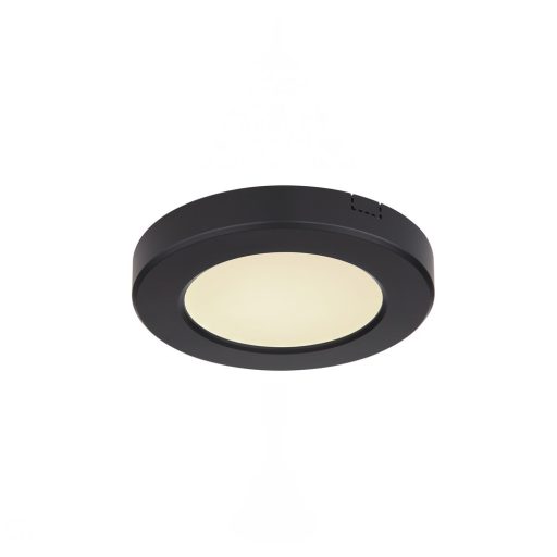 Fekete színű műanyag keretes mennyezeti lámpa opálos műanyag búrával, 6W beépített LED fényforrással. A lámpa színhőmérséklete fali kapcsoló segítségével 3000-4000-6500K között 3 lépésben kapcsolható.