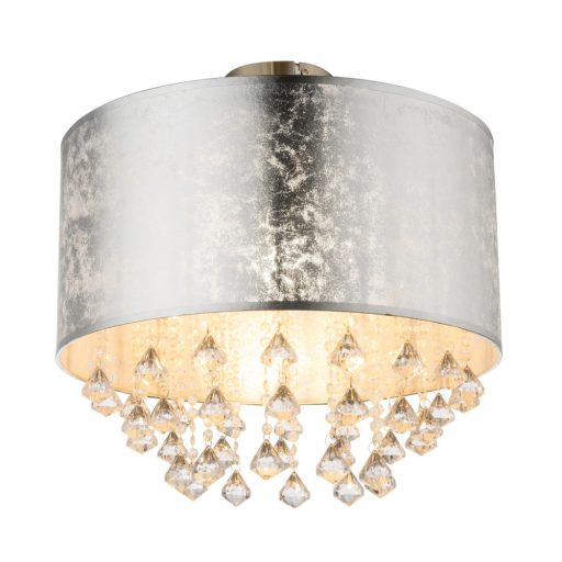Matt nikkel színű fém vázas mennyezeti lámpa ezüst színű textil búrával, akril kristály dekorral.