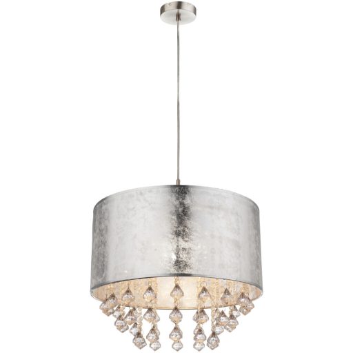 Matt nikkel színű fém vázas függeszték ezüst színű textil búrával, akril kristály dekorral.