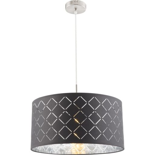 Matt nikkel színű fém vázas függeszték szürke színű kívül bársony belül pedig ezüst színű műanyag ernyővel.