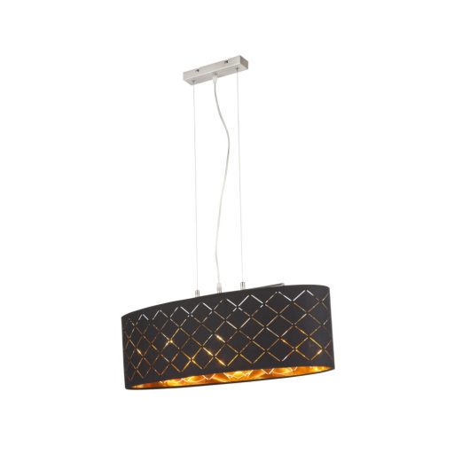 Matt nikkel színű fém vázas függeszték fekete színű kívül bársony belül pedig arany színű műanyag ernyővel.