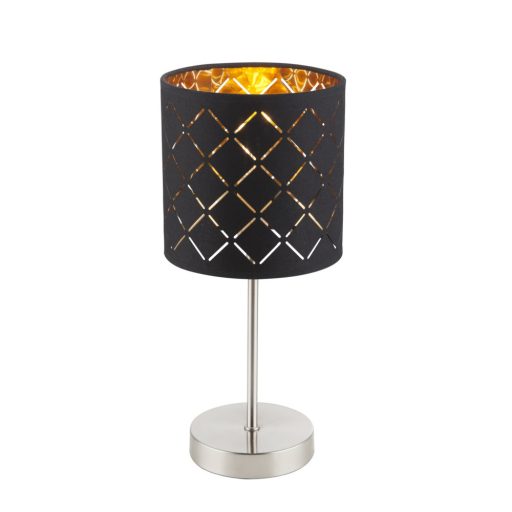Matt nikkel színű fém vázas asztali lámpa fekete színű kívül bársony belül pedig arany színű műanyag ernyővel, vezetékre szerelt kapcsolóval.