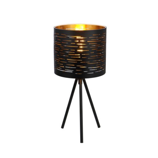 Fekete színű fém vázas asztali lámpa fekete és arany színű műanyag búrával, vezetékre szerelt kapcsolóval.