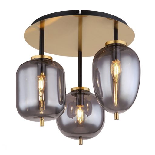 Matt sárgaréz és fekete színű fém vázas mennyezeti lámpa füstszínű üveg búrával, E14-es foglalattal. Filament LED fényforrást ajánlunk hozzá, ami nem tartozék.