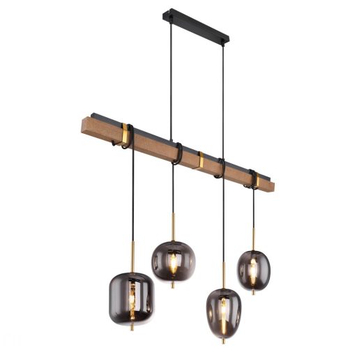 Matt fekete színű fém vázas, sárgaréz dekoros függeszték lámpa fa betéttel és füstszínű üveg búrával, E14-es foglalattal. Filament LED fényforrást ajánlunk hozzá, ami nem tartozék. A búrák átmérője 15,8cm, 16,4cm, 16,5cm és 18,5cm.