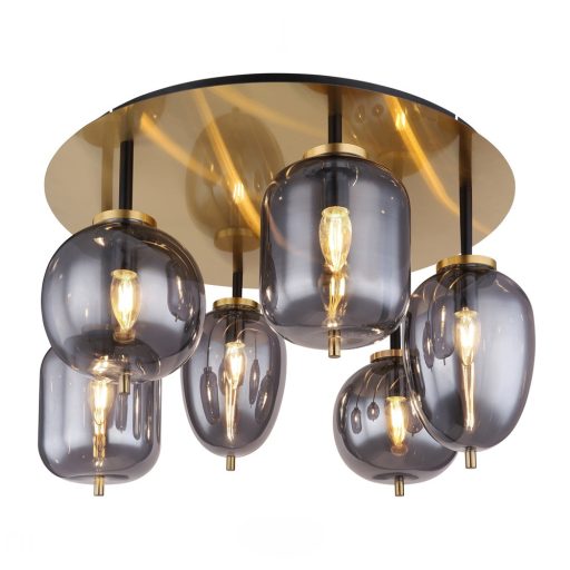 Matt sárgaréz és fekete színű fém vázas mennyezeti lámpa füstszínű üveg búrával, E14-es foglalattal. Filament LED fényforrást ajánlunk hozzá, ami nem tartozék.