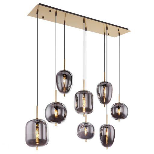Matt sárgaréz és fekete színű fém vázas függeszték lámpa füstszínű üveg búrával, E14-es foglalattal. Filament LED fényforrást ajánlunk hozzá, ami nem tartozék. A búrák átmérője 3db-nak 15,8cm, 3db-nak 18,5cm, 2-nek 16,5cm.