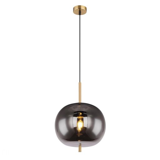 Matt sárgaréz színű fém vázas függeszték lámpa füstszínű üveg búrával, E27-es foglalattal. Filament LED fényforrást ajánlunk hozzá, ami nem tartozék.
