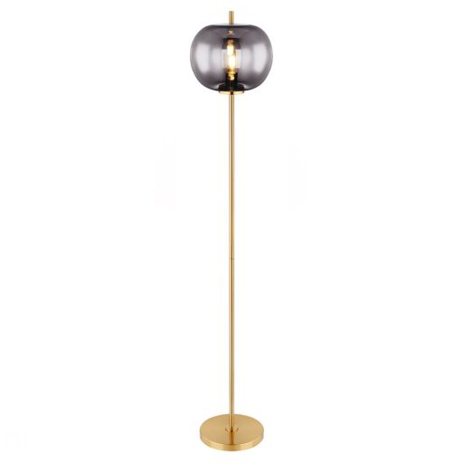 Matt sárgaréz színű fém vázas álló lámpa füstszínű üveg búrával, E27-es foglalattal, vezetékre szerelt kapcsolóval. Filament LED fényforrást ajánlunk hozzá, ami nem tartozék.