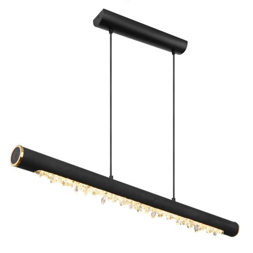 Matt fekete színű fém vázas függeszték lámpa sárgaréz betéttel, fekete színű fa búrával, műanyag kristály dekorral, 15W meleg fehér színhőmérsékletű beépített LED fényforrással. A lámpa fényereje fali kapcsoló segítségével 3 lépcsőben (10-40-100%) szabályozható.