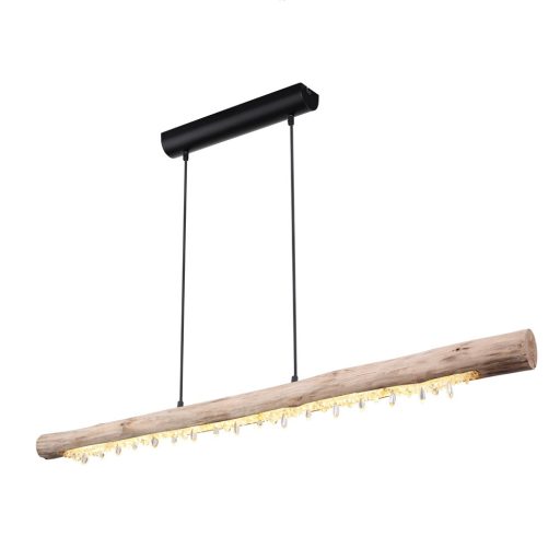 Matt fekete színű fém vázas függeszték lámpa natúr fa búrával, műanyag kristály dekorral, 20W meleg fehér színhőmérsékletű beépített LED fényforrással, textil bevonatos kábellel. A lámpa fényereje fali kapcsoló segítségével 3 lépcsőben (10-40-100%) szabályozható.
