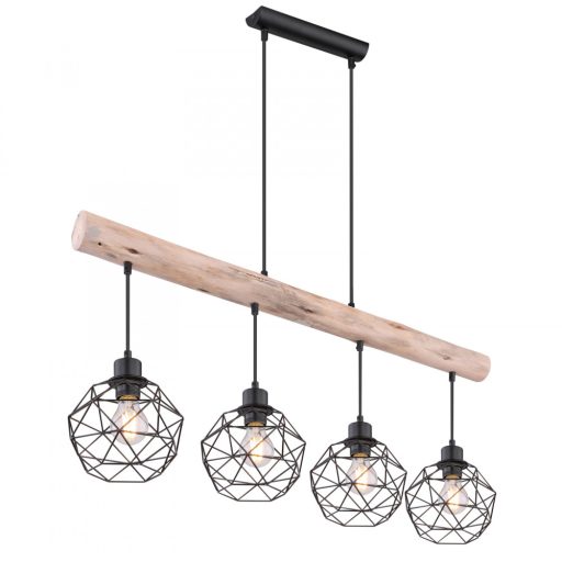Természet közeli megjelenésű függeszték lámpa fekete színű fém vázzal, natúr fa dekorral, fekete színű fémrács búrával.