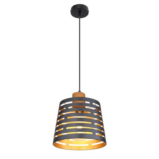 Fekete színű fém vázas függeszték lámpa fa betéttel, kívül fekete, belül arany színű perforált fém ernyővel, E27-es foglalattal.