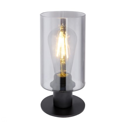Matt fekete színű fém vázas asztali lámpa füstszínű üveg búrával, 1db E27-es foglalattal, vezetékre szerelt kapcsolóval. Filament LED fényforrással mutat a legjobban, ami nem tartozék.