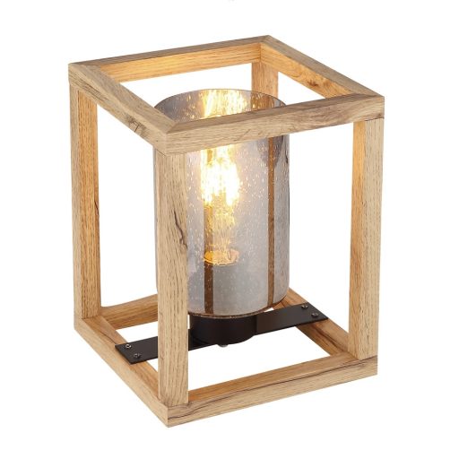 Matt fekete színű fém vázas asztali lámpa natur fa keretes, fröcskölt mintás füstös üveg búrával, E27-es foglalattal, vezetékre szerelt kapcsolóval. Filament LED fényforrással mutat a legjobban, ami nem tartozék.
