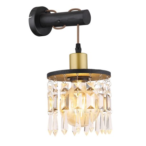 Matt fekete színű fém vázas fali lámpa fekete színű fa betéttel, üveg kristály búrával, E27-es foglalattal, textil kábellel.