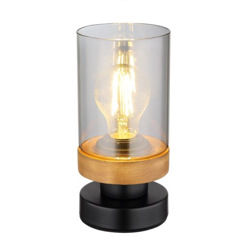 Fekete színű fém vázas asztali lámpa fa betétes, füstszínű üveg búrával, vezetékre szerelt kapcsolóval. A lámpa dekor, vagy filament fényorrással mutat a legjobban, ami nem tartozék.