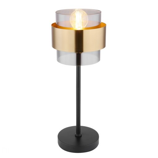 Matt fekete színű fém vázas asztali lámpa sárgaréz dekoros üveg búrával, E27-es foglalattal, vezetékre szerelt kapcsolóval. Filament LED fényforrást ajánlunk hozzá, ami nem tartozék.