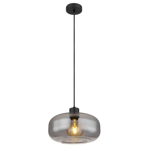 Matt fekete színű fém vázas függeszték lámpa füstszínű üveg búrával, E27-es foglalattal.