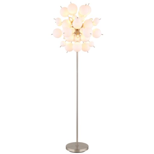 Állólámpa fém nikkel matt, fehér színű üveggömbök, fekete PVC kábel, lábpedálos kapcsoló a kábelen, ø: 550mm, M: 1550mm, kábel hossza 1800mm, üveggömbök átmérője: 24 x 6 cm, 24 x 10 cm, 6x E14 25W 230V izzók nélkül