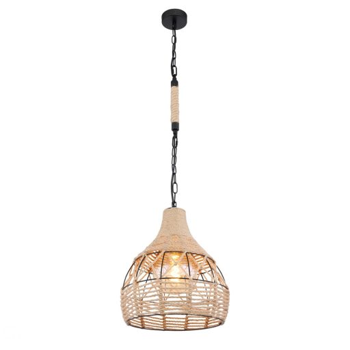 Fekete színű fém függeszték lámpa kenderrel díszített fémrács búrával, E27-es foglalattal. Filament LED vagy dekor fényforrással mutat a legjobban, ami nem tartozék.