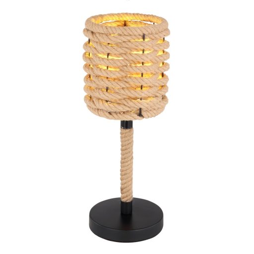 Matt fekete színű fém vázas asztali lámpa sodort kender dekorral, fém vázas, kender bevonatos búrával, E27-es foglalattal, vezetékre szerelt kapcsolóval. Filament LED fényforrással mutat a legjobban, ami nem tartozék.