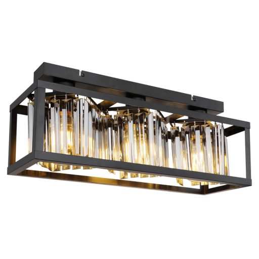 Matt fekete színű fém vázas mennyezeti lámpa fém keretes füstszínű acryl kristály búrával, E27-es foglalattal.