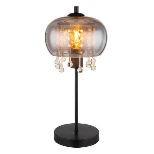 Matt fekete színű fém vázas asztali lámpa füstszínű üveg búrával, átlátszó, csepp alakban végződő üveg kristály dekorral, E27-es foglalattal, vezetékre szerelt kapcsolóval.
