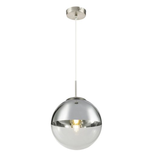 Matt nikkel színű fém vázas függeszték felül króm, alul átlátszó gömb formájú üveg búrával.
