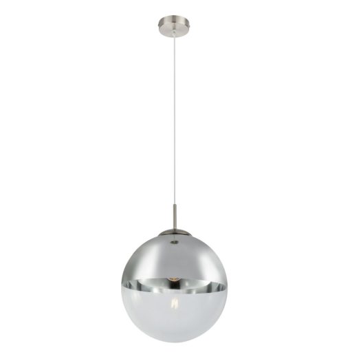 Matt nikkel színű fém vázas függeszték felül króm, alul átlátszó gömb formájú üveg búrával.