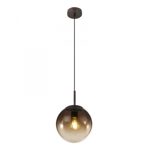 Barna színű fém vázas függeszték színátmenetes, borostyán színű gömb formájú üveg búrával.