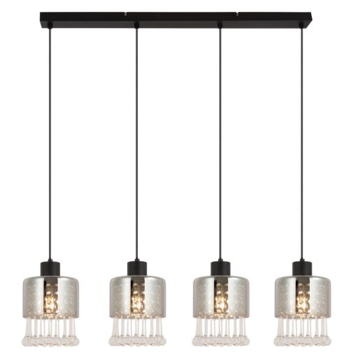 Matt fekete színű fém vázas függeszték füstszínű üveg búrával, akril kristály, és csepp alakú üveg kristály dekorral, E27-es foglalattal.