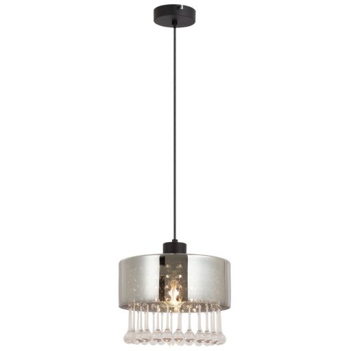 Matt fekete színű fém vázas függeszték füstszínű üveg búrával, akril kristály, és csepp alakú üveg kristály dekorral, E27-es foglalattal.