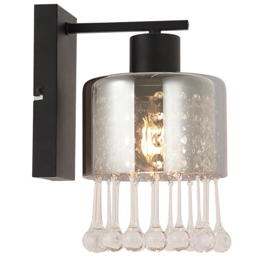 Matt fekete színű fém vázas falikar füstszínű üveg búrával, akril kristály, és csepp alakú üveg kristály dekorral, E27-es foglalattal.