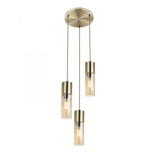 Sárgaréz színű fém vázas függeszték borostyán színű üveg búrával, texil kábellel.