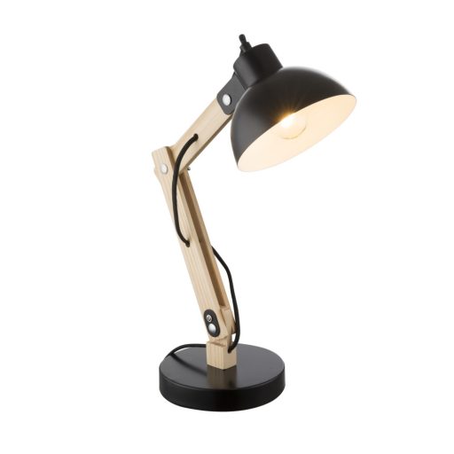 Fekete színű fém vázas, natúr fa betétes, fém ernyős asztali lámpa dönthető karral és vezetékre szerelt kapcsolóval.