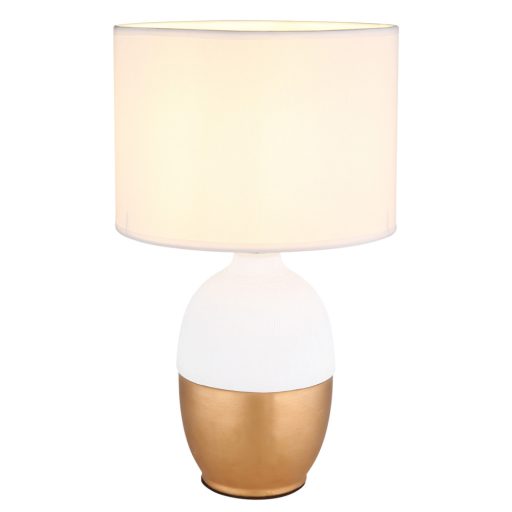 Fehér és arany színű kerámia lábas asztali lámpa fehér színű textil lámpaernyővel, E14-es foglalattal, vezetékre szerelt kapcsolóval.