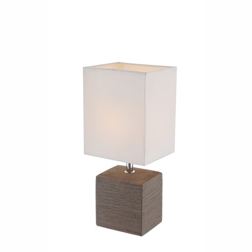 Barna színű szögletes, kerámia vázas asztali lámpa fehér textil búrával, vezetékre szerelt kapcsolóval.