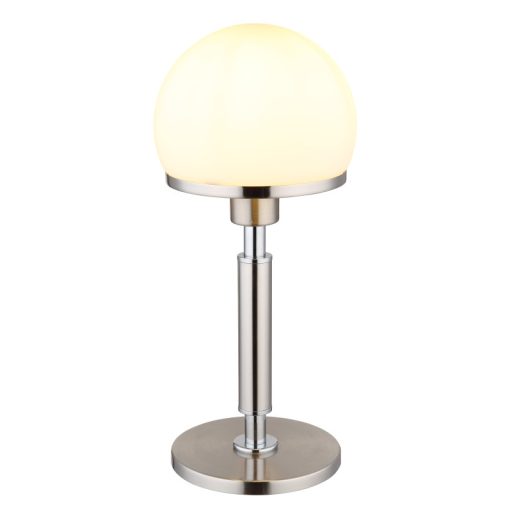 Asztali lámpa fém nikkel matt, fém krómozott, fehér színű üveg búra, fekete textil kábel, billenőkapcsoló a kábelen, ø: 180mm, M: 400mm, kábel hossza 1500mm, 1x E27 40W 230V izzó nélkül
