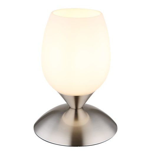 Asztali lámpa fém nikkel matt, fehér színű üveg búra, fekete PVC kábel, érintő kapcsoló, ø: 125mm, M: 180mm, kábel hossza 1500mm, 1x E14 25W 230V izzó nélkül