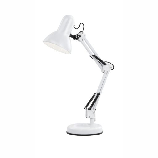 Fehér színű fém vázas, műanyag betétes asztali lámpa, állítható karral és fejjel, vezetékre szerelt kapcsolóval.