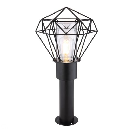 Fekete színű rozsdamentes acél kültéri álló lámpa átlátszó műanyag betétes nyitott fémrács búrával, E27-es foglalattal, IP44-es védelemmel. A lámpa 50 cm magas.