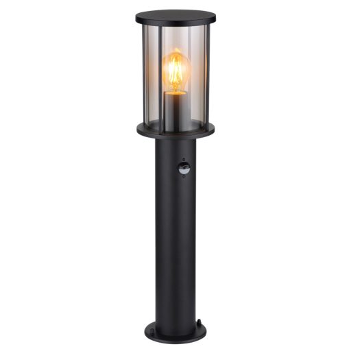 Matt fekete színre festett rozsdamentes acél mozgás érzékelős álló lámpa füstüveg búrával, E27-es foglalattal.