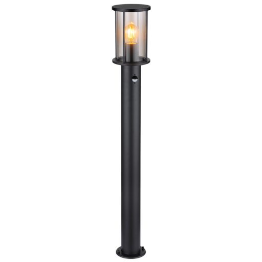 Matt fekete színre festett rozsdamentes acél mozgás érzékelős álló lámpa füstüveg búrával, E27-es foglalattal.